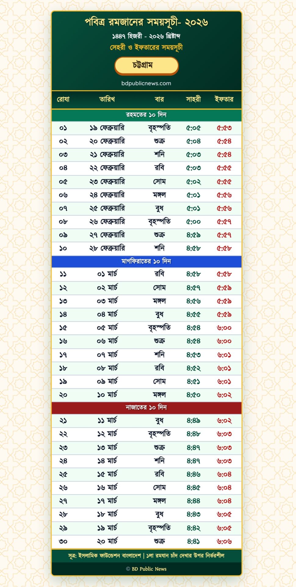 Ramadan 2026 Calendar Sehri & Iftar Timetable – Chattogram Division