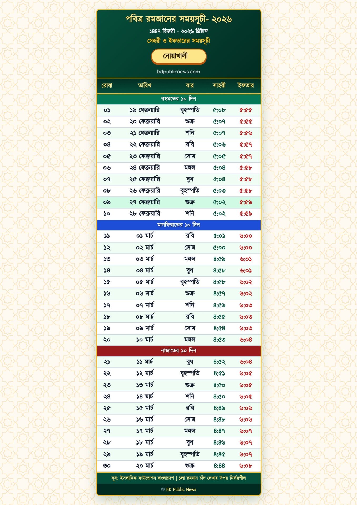 Noakhali District Ramadan Calendar 2026