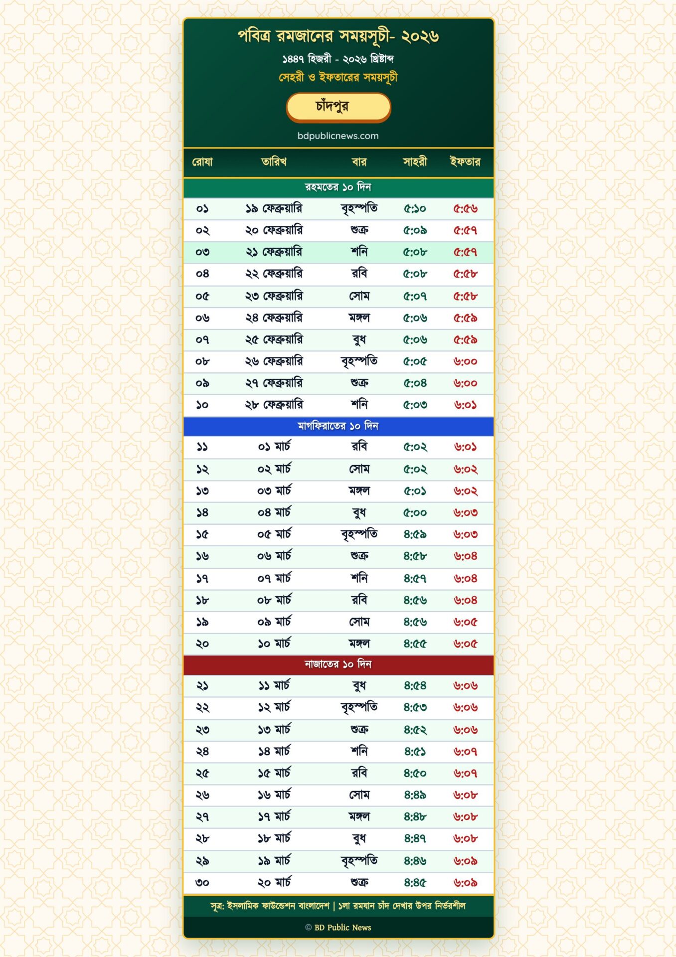 Chandpur District Ramadan Time Table 2026